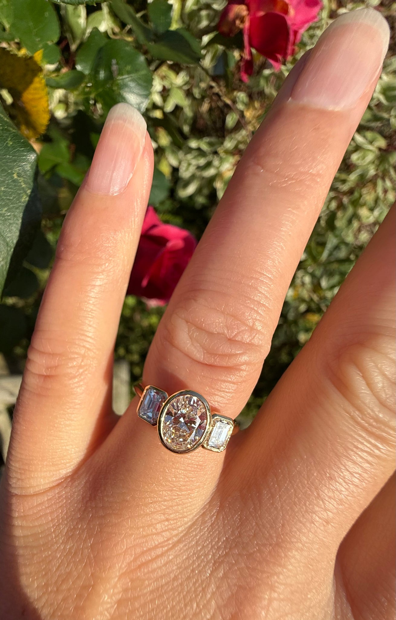 The design blends the sparkling brilliance of the oval cut diamond with the mirrored open facets of emerald cuts. All three of the natural diamonds are of beautiful quality and they've been encased in a sleek, 'wed-fit' bezel setting.